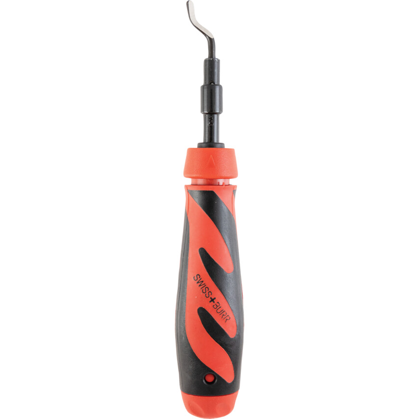 The Swiss+Burr hand chamfering and countersinking set features and interchangeable ergonomic grip handle with an F type blade holder and F20 countersink. A fast, effective and efficient way of deburring holes, slots and edges the modular system of interchangeable handles, holders and blades designed to cover all applications.