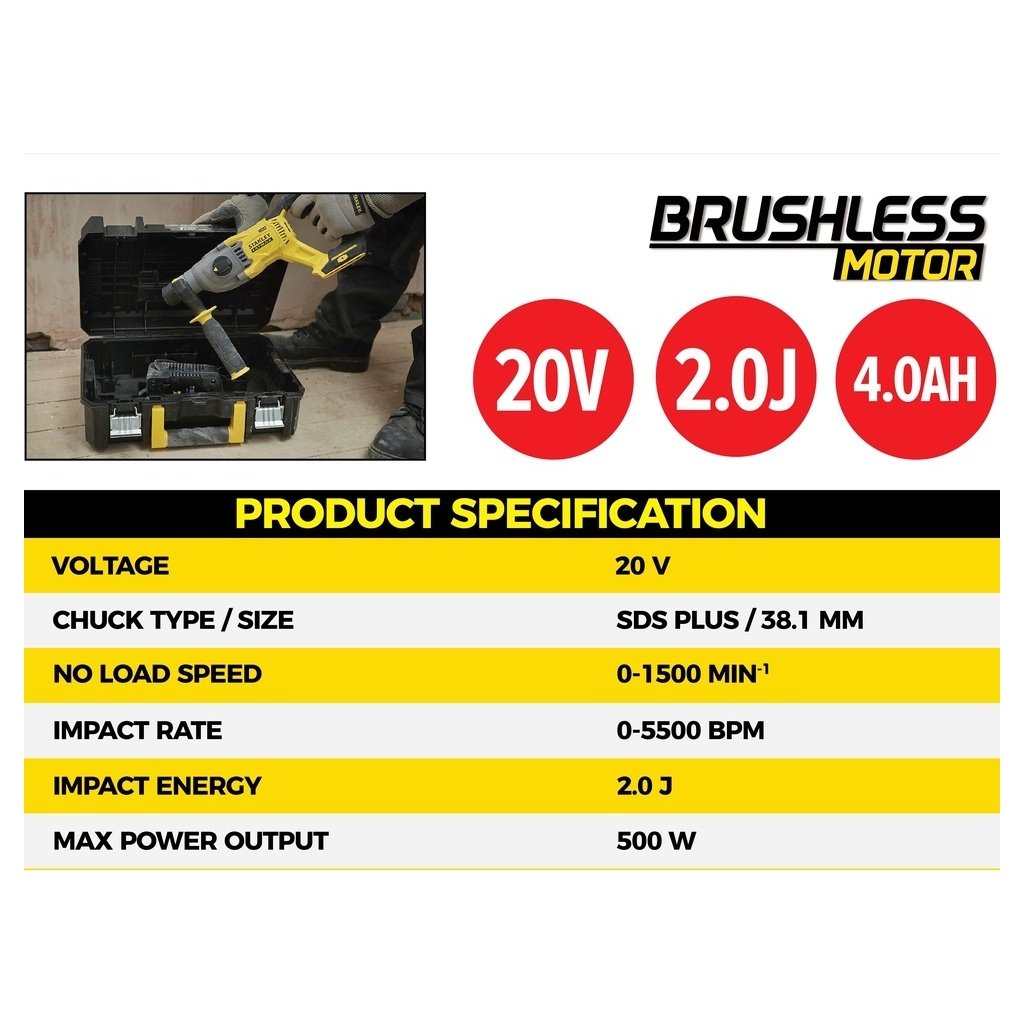 Stanley SBH900M2K 20V Cordless Rotary Hammer Drill 4.0h 2200RPM 5775BPM With 2 Battery 1 Charger