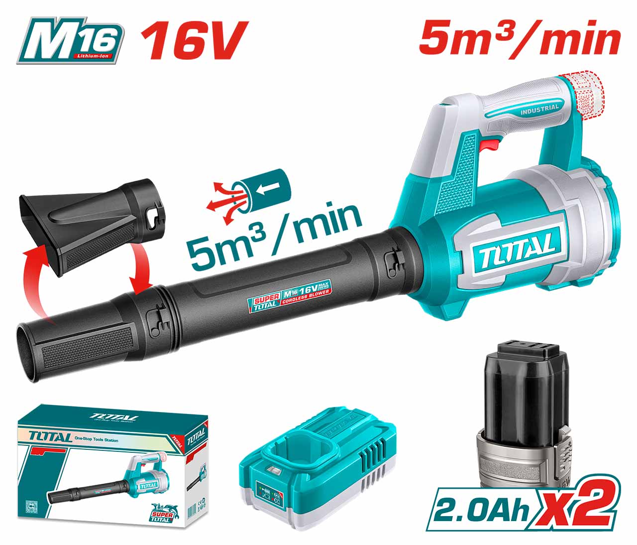 voltage 16V ⎓ battery 2 pcs Li-ion 2.0Ah batteries charger 1 pc 2 hours charger charger volts 220-240V ~ 50/60Hz no-load speed 0-13000/min Average air volume 5m3/min Max. air speed 50m/s