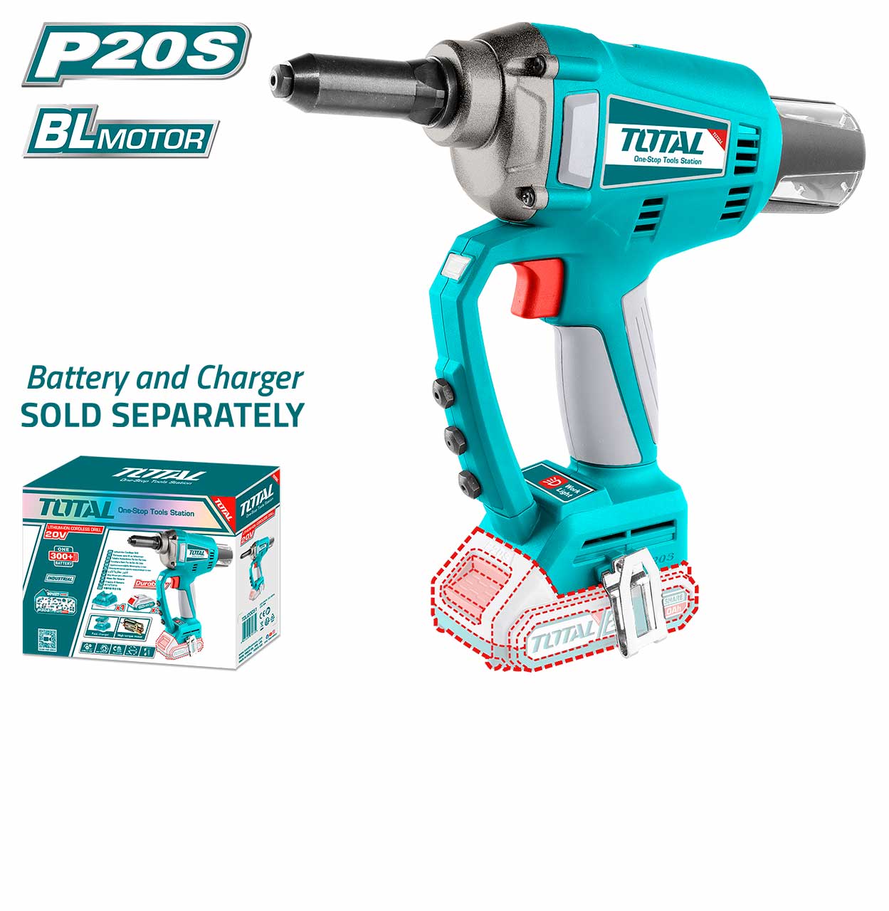 Integrated work light and features a 25mm travel / stroke that sets most rivets in one stroke.